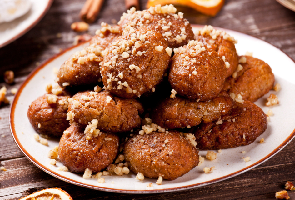 Традиционное греческое печенье с мёдом и орехами, которое пекут на праздники, особенно на Рождество. Ароматное тесто с корицей и апельсином запекается до золотистой корочки, затем пропитывается тёплым медовым сиропом и щедро посыпается грецкими орехами.